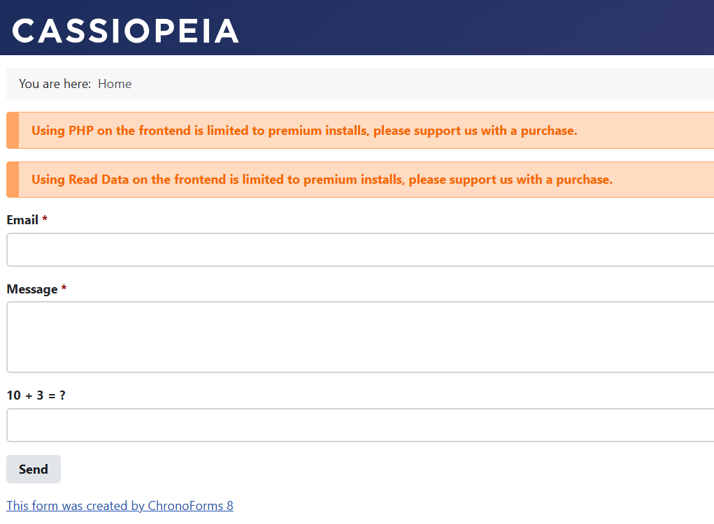 The free version of ChronoForms is fully functional except that it adds a "Powered by ChronoForms" strap-line under each form and email and shows you a pink reminder message in the Forms Manager.