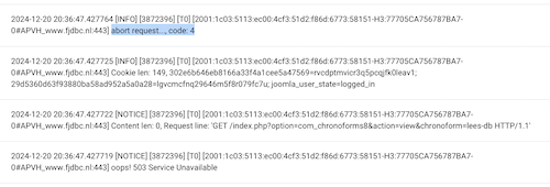 2024-12-29 20:19:32.637215 [INFO] [2370813] [T0] [2001:1c03:5113:ec00:d988:fd72:8979:892a:62663-H3:B4613A93FA1D04FA-12#APVH_www.fjdbc.nl:443] connection to [uds://usr/local/lsws/extapp-sock/APVH_dtouycuj_Suphp.sock] on request #0, confirmed, 1, associated process: 2609899, running: 1, error: Connection reset by peer!2024-12-29 20:19:32.637284 [NOTICE] [2370813] [T0] [2001:1c03:5113:ec00:d988:fd72:8979:892a:62663-H3:B4613A93FA1D04FA-12#APVH_www.fjdbc.nl:443] oops! 503 Service Unavailable