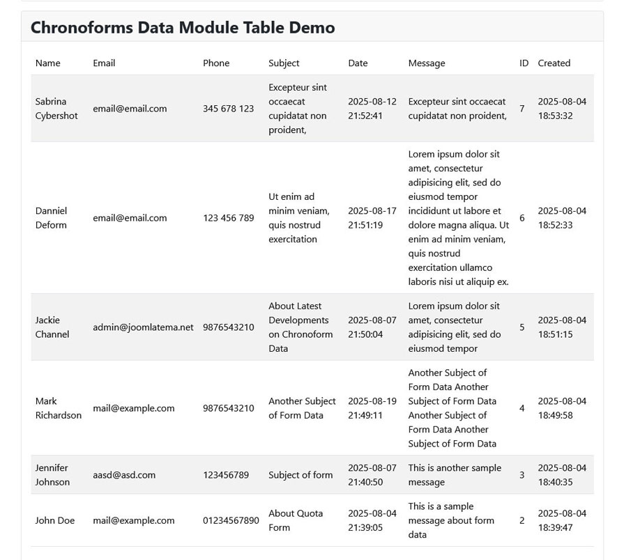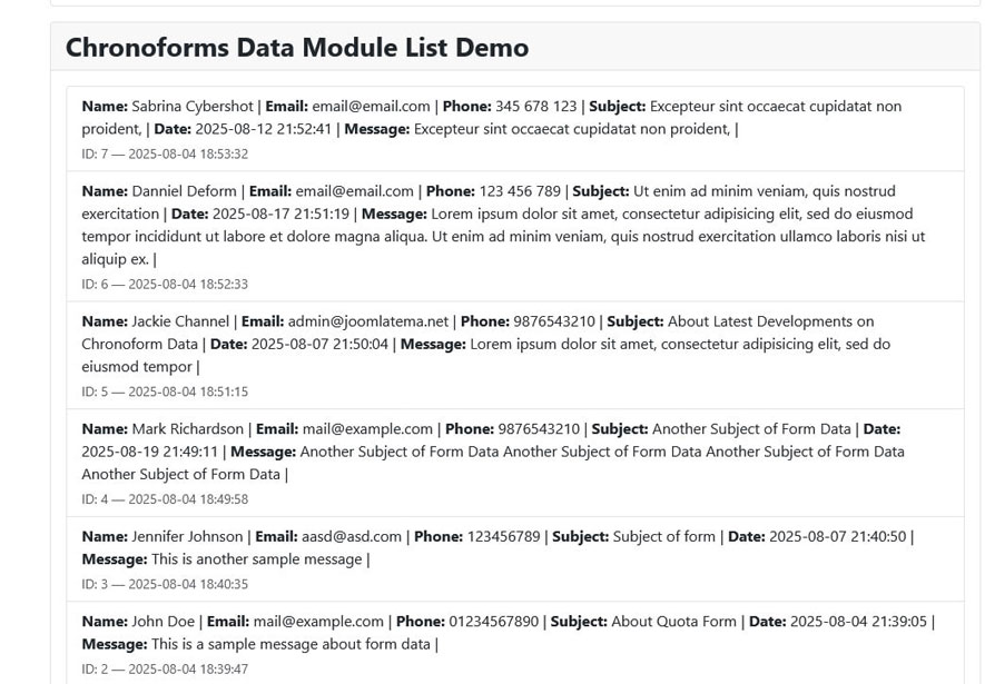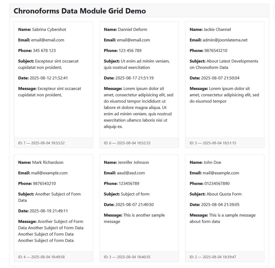 This module is designed to fetch and display submissions stored in the Chronoforms _datalog table. It provides multiple layout options to display form data from Chronoforms instances in an organized and styled manner.