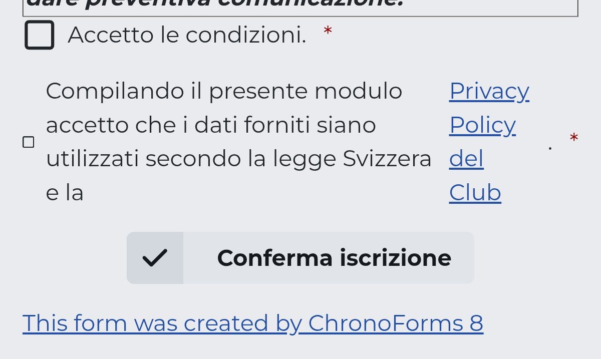 Compilando il presente modulo accetto che i dati forniti siano utilizzati secondo la legge Svizzera e la <a href="/index.php/informativa-sulla-privacy" target="_blank">Privacy Policy del Club</a>.