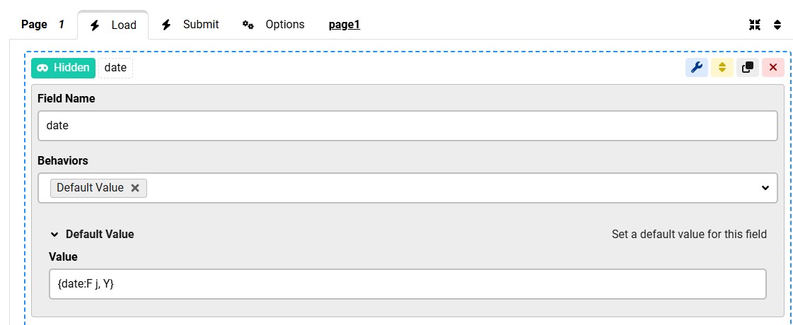 There is no action in the LOAD EVENT other than a hidden field of DATE and a Default value (I tried to remove this but the error is still there), the same entry strings as above. See screenshot: