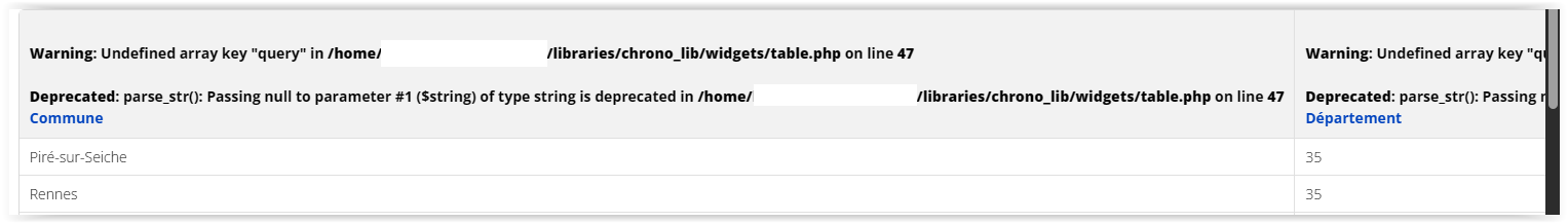 I'm encountering two errors in the header of a table. It seems there's a call to a deprecated function in table.php, line 47.